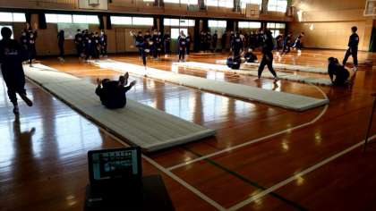 3年生女子体育でマット運動の練習中。今日のメニューは「倒立前転」。体育館にタブレット端末(動画モード)がセットされ、前転のようすを撮影します。自身のフォームがすぐに確認できるのでスキルアップに役立ちますね。