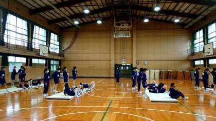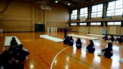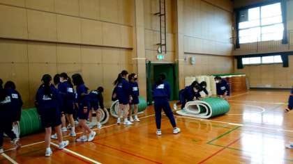 準備運動が済んだら、みんなでマットを用意します。手際よくマットが敷かれ、早速練習スタート。グループになって、互いに声をかけながら練習を進めています。