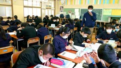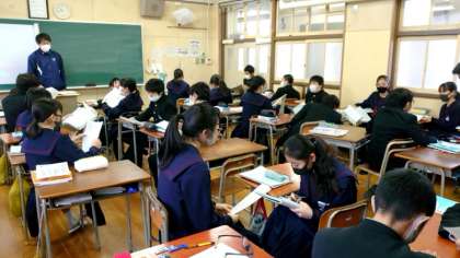 2年生英語科でこれまでの学習内容を振り返ります。まずはいつもの単語学習から。互いにペアを組んで単語のテストに取り組みます。スペルや発音は覚えられましたか?