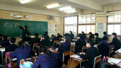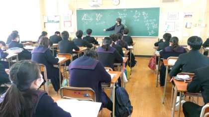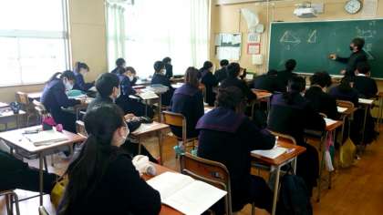 3年生数学科で図形の角度を求める問題に挑戦中。入試でもよく出題されるお馴染みの問題です。さまざまなパターン(問題&解法)をマスターすることが大切とのこと。多くの問題に繰り返し取り組みましょう。