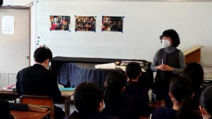 2年生音楽の授業で「文楽(人形浄瑠璃)」を学習中。前回の授業ではVTRで「曽根崎心中」のハイライトを視聴しました。今日は教科書で文楽の特徴を教わります。日本の伝統芸能に触れる・親しむ良い機会にしてくださいね。