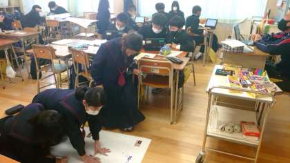 1年生は世界の国々の調べ学習に取り組みます。来週金曜日、大阪にやってきた留学生の方々とオンライン交流会を行います。現在、交流会にむけた「壁新聞」を作成中。タイやマレーシアなど留学生の母国の特徴をまとめます。皆さんとっても楽しそうですね。
