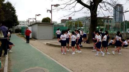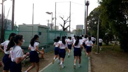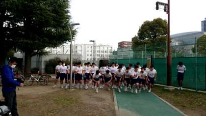 快晴だった空に雲が広がってきましたが、皆さん元気にスタートしました。風が無いのが何よりです。中学校生活最後の持久走。皆さんよく頑張りました。