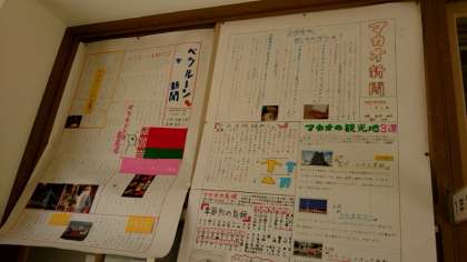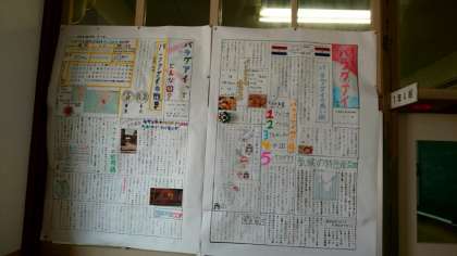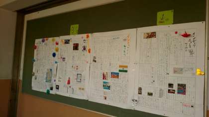 1年生教室前に世界の国々の壁新聞を掲示中。本日交流する予定の留学生の方々の母国を調べました。食事や習慣、自然環境などさまざまな特色がまとめられていますね。