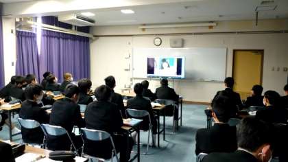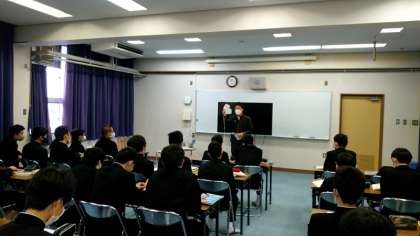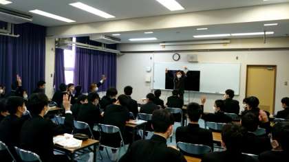 2年生男子(保健)で「心肺蘇生法」を学習中。AED(自動体外式除細動器)を使った心肺蘇生法について教わります。高津中ではAEDを2台設置し、緊急時に備えています。尊い生命を救う大切な機器。操作方法を知ることはとても重要です。