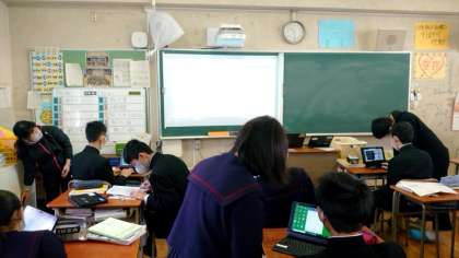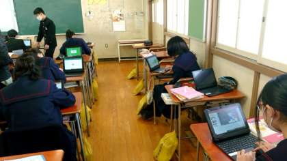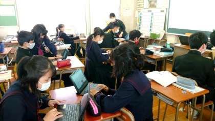 2年生国語科でパソコンを使って資料(調べ学習)を作成中。テーマは「ユニバーサルデザイン」について。1人1台パソコンを使ってまとめた資料が完成し、各自が先生のパソコンへデータを転送し始めました。学校と家庭を結ぶオンライン学習の練習にもなりそうです。