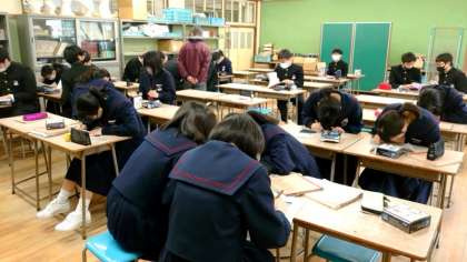 3年生美術科で「スクラッチアート」に取り組みます。透明板にニードル(とがったペン)でイラストを描きます。LEDが組み込まれた土台に透明板を差し込むと、イラストが青白く光るとのこと。美術の授業で製作する最後の作品です。ステキな作品に仕上げてくださいね。