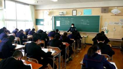 現在2時間目「社会」のテストが行われています。地理・歴史分野から幅広く出題されている模様。記憶をたよりにペンを走らせます。ケアレスミスに注意して、くり返し自身の回答を見直しましょう。