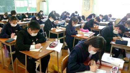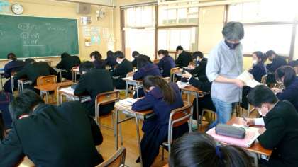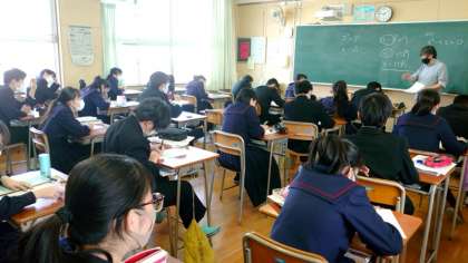 3年生数学科の授業で入試対策に取り組んでいます。入試問題の最初に出てくる計算問題(過去問)を解き進めます。計算問題の出来具合が合否を左右する大切なポイントです。公立高校(一般選抜)入試まであと2週間。万全の態勢でテストにのぞんでくださいね。