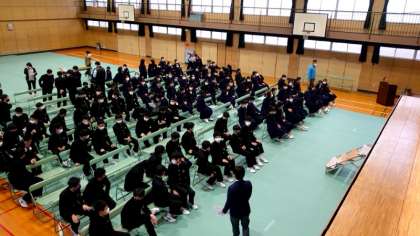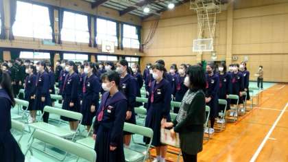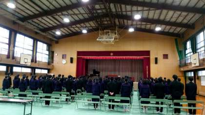 3年生の皆さんが卒業式の練習に取り組んでいます。今日はイスを並べて式当日の状態で着席します。式では「起立・礼・着席」する場面がいくつかあります。動きがバラバラにならないよう、全員の呼吸をあわせて練習しています。
