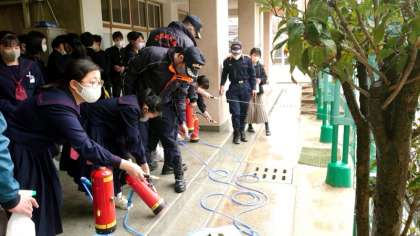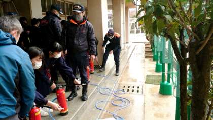 あいにくの雨のため(身体が濡れない)廊下からの放水体験となりました。消火器の取り扱いに慣れるためのプログラム。皆さん概ね体得できたようですね。