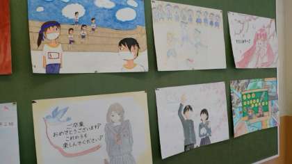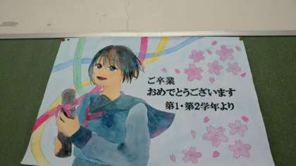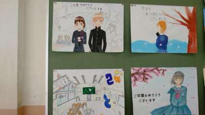 送る会のビデオで紹介されたイラスト(絵画)が3年生の教室前に飾られています。後輩たちが心をこめて描いた作品がならぶと、卒業にむけた雰囲気も高まりますね。