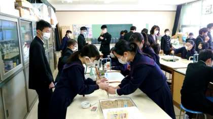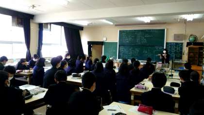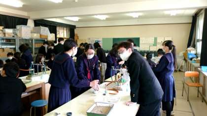 2年生理科の授業で実験を行っています。「鉄とイオウの化合物」を加熱し、反応を調べます。班ごとに役割を決めて実験に取り組みます。ガスバーナーでヤケドしないよう気をつけてくださいね。
