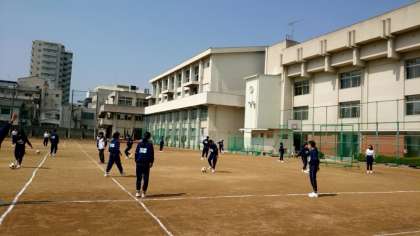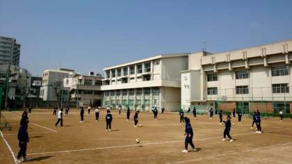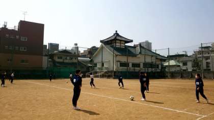 1年生女子体育でサッカーの練習中。今日のメニューは上手なパスのつなぎ方。お互いに声をかけあい、ねらった場所にボールを蹴りだします。今日はお天気も良く、皆さん気持ちよくボールを追いかけています。