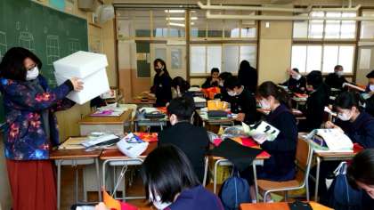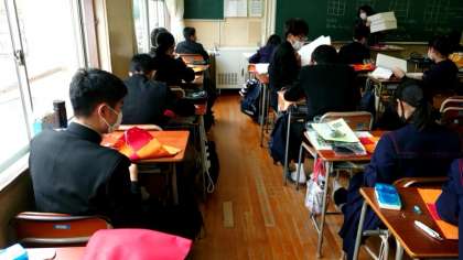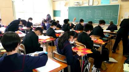 2年生家庭科でフカフカのクッションを製作中。カラフルな布を縫い合わせ、好みのデザインに仕上げます。お裁縫が得意な人はどんどん作業が進みます。互いに教えあいながら完成をめざしましょう。