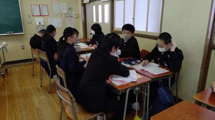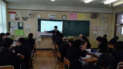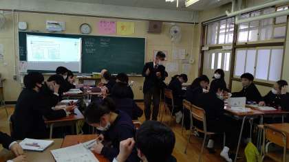 2年生数学科で「ヒストグラム」と「箱ひげ図」を用いて、資料から優勝チームを考えています。データの散らばりのようすが、ヒストグラムや箱ひげ図に形として表れます。どのような見方ができるか、みんなで分析しました。