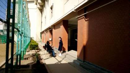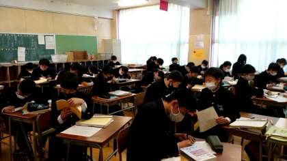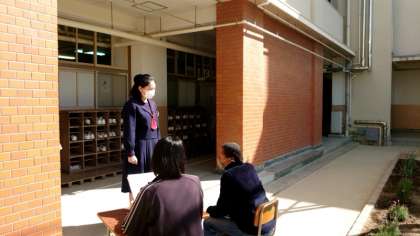 1年生英語科で英会話のテスト中。C−NETのタマラ先生とマンツーマンでやりとりします。今回のテーマは「中学生になって出かけた場所」。皆さん緊張しながらも上手にお話できていました。