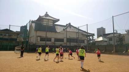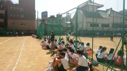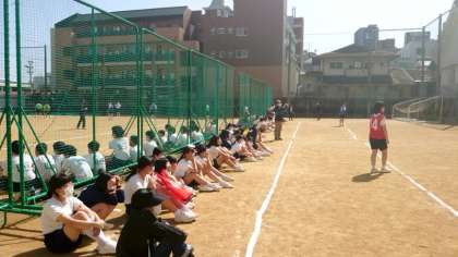 クラス対抗戦では仲間の声援がプレーの後押しをしてくれます。皆さんクラスメイトの頑張りを必死になって応援中。1年最後の学年競技が、さわやかな雰囲気の中、行われています。