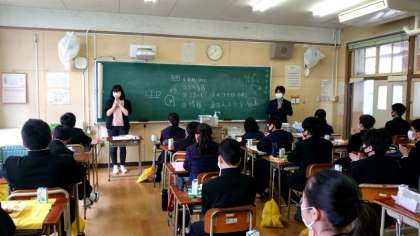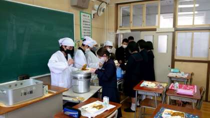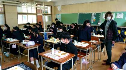 昼休みのチャイムが鳴りました。皆さんお楽しみの昼食の時間です。今日は「カツカレー、フルーツ白玉」をいただきます。献立表を見ると「入学祝いメニュー」とのこと。皆さん美味しくいただきましょう。
