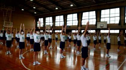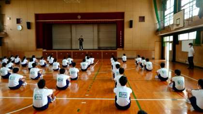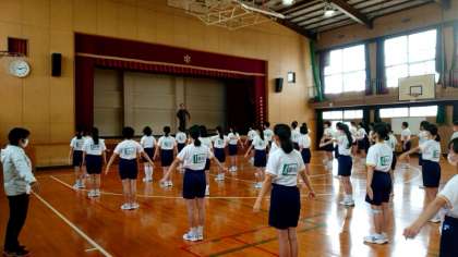 2年生の号令が聞こえてきました。今朝は運動場の水が引かず、体育館で授業を受けています。まずは「ラジオ体操」の復習から。1つ1つの動きを全員で確かめながら、メリハリのある美しい体操を追究します。皆さんカッコ良いですよ。