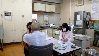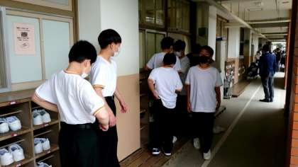 1年生の皆さんが内科検診を受診中。昼食後、体操服に着替えて保健室に向かいます。おしゃべり禁物でおりこうさんにしてくださいね。校医先生、よろしくお願いいたします。