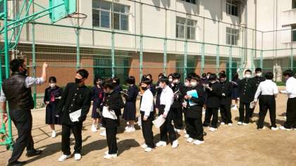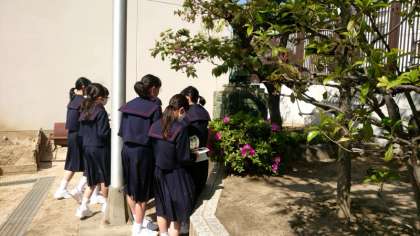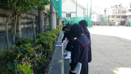 1年生理科の授業で「野草の観察」を行います。校内に自生する野草(雑草)を見つけて、名前や特徴を調べます。お天気も良く、絶好の観察日和ですね。