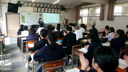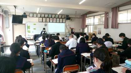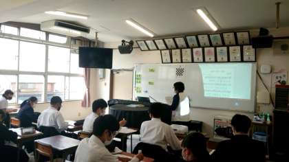 2年生音楽の授業で、高津中学校の校歌を学習中。先生曰く「リズムの取り方が難しい曲」とのこと。1年間慣れ親しんできた曲ですが、改めておさらいします。曲の特色を教わると、より気持ちを込めて歌えるようになりそうです。