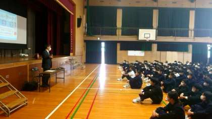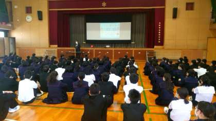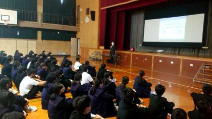2年生の皆さんが「携帯・スマホ安全教室」を受講中。NTTドコモから講師の先生に来ていただき、スマホにまつわるトラブルを教わります。皆さん、ドラマ仕立ての動画を視聴しながら適切な使い方を学んでいます。