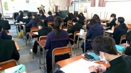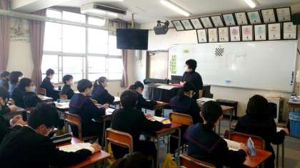 1年生音楽科の授業が行われています。先生から必要な持ち物や年間計画(予定)の説明がありました。年に3回(期末テスト時)、ペーパーテストも行われるとのこと。忘れ物をしないよう1年間頑張りましょう!