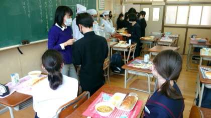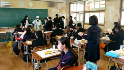 1年生の皆さんが給食の配膳中。今日のメニューは「カレースープスパゲッティ・キャベツのピクルス・リンゴ」です。おしゃべりしながら食べたいですが、今は少しガマンして…。みんなで美味しくいただきましょう。