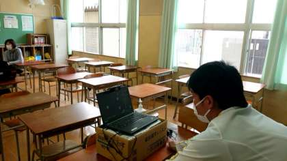 オンライン学習にむけたパソコンの接続テストが1年生で始まっています。各教室で先生方が待つ中、帰宅した1年生がオンラインに接続してきました。通信負荷がかかるため、画像・音声オフなのが残念ですね。生徒本人の姿は見られませんが、次々につながっている模様です。