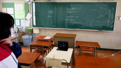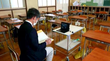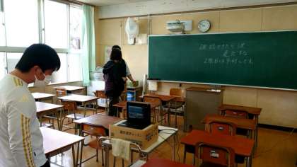 今朝も各教室でオンライン接続テストを実施中。パソコンを通した朝のあいさつ。皆さん先生の呼びかけにしっかりと応えています。