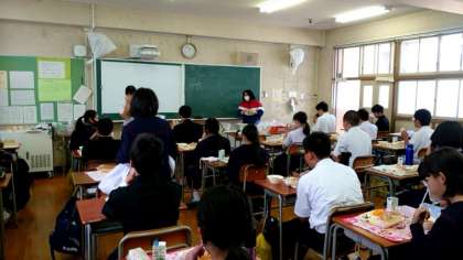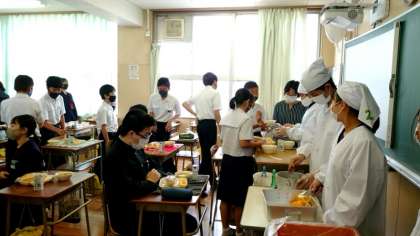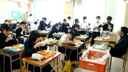 お家で学習していた皆さんが登校し、今からお昼の給食タイム。今日のメニューは「ビーフシチュー・さんどまめとコーンのサラダ・あまなつかん(果実)」。みんなと一緒に過ごすお昼の時間はほっこりして良いですね。