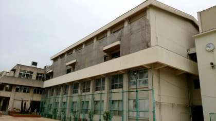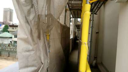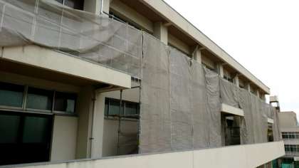 体育館のエアコン設置工事開始にともない、作業のための足場が組みあがりました。災害発生時の避難場所として利用される体育館。真夏に避難所を開設した場合、熱中症等の暑さ対策のためエアコンを設置するそうです。当分の間、体育館のベランダが通行できなくなりますが、辛抱してくださいね。