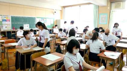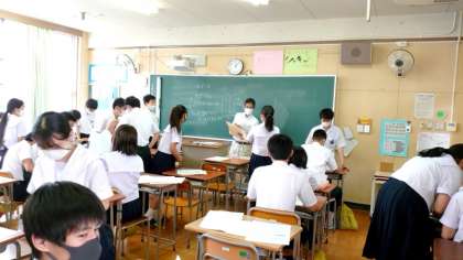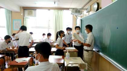 3年生のあるクラスでは数学のテスト結果を返却中。お互いに点数を見せ合い、苦笑いする人や喜び合う人など、緊張していた1年生に比べて、何だか楽しげな様子ですね。