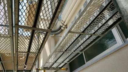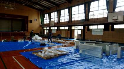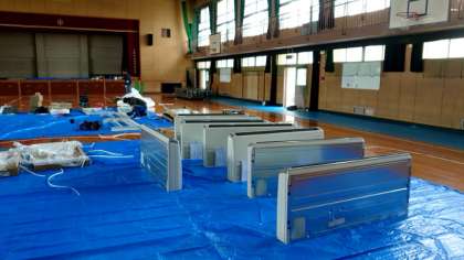 体育館のエアコン設置工事が進んでいます。今日から体育館内に機器を設置する工程に入りました。今週〜来週にかけて体育館が使えなくなりますが、辛抱してください。