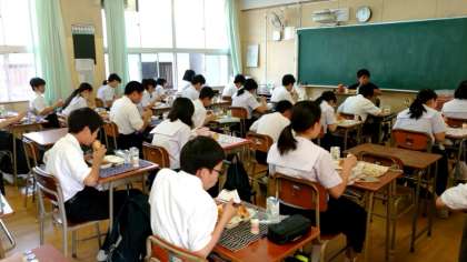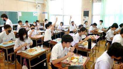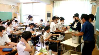 お昼休みになり、皆さん楽しみの給食の時間です。今日のメニューは「ミートソース・スパゲッティ」。人気の献立とあって、各教室で「おかわり!」の手が次々に挙がっています。いっぱい食べて午後からの活動も頑張りましょう!