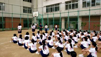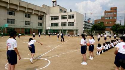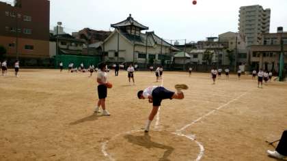 1年生体育科で「ハンドボール投」を測定中。各自2投ずつチャレンジします。少しでも遠く投げられるよう、全身を上手に使います。友達の声援を力に変えて、自己ベストをめざしましょう。