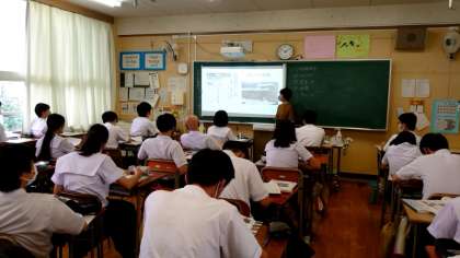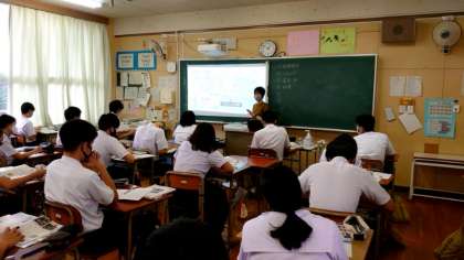 3年生社会科で第二次世界大戦後の歴史を学習中。今日は「東西冷戦」を中心に世界のできごとを教わります。スクリーンには世界地図や当時の新聞記事が映され、当時のようすが再現されます。画像や映像を見ると、より歴史を身近に感じることができますね。