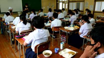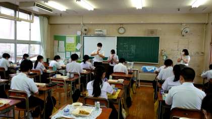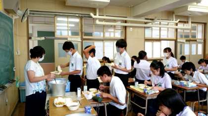 お昼のチャイムが鳴り、給食の準備が始まりました。今日のメニューは「和風カレー丼」。各教室では給食当番さんが配食に大忙し。大盛りのリクエストも多い模様です。