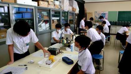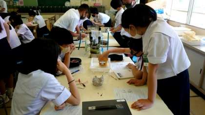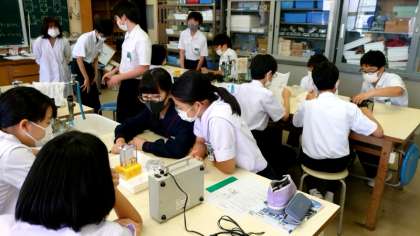 2年生理科の授業で「水の電気分解」を実験中。実験では、水酸化ナトリウムの水溶液を電気分解し、発生した気体を調べます。水酸化ナトリウムはアルカリ性が強いため、肌に触れないよう注意が必要。皆さん慎重に取り組めていましたね。