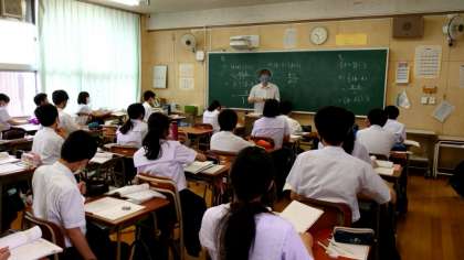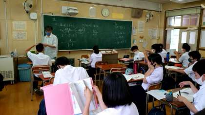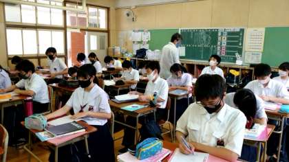 1年生数学科で文字式の計算を復習中。先生から解き方を教わった後、関連するプリントが次々に配られます。多くの問題を解くことで実践力が培われるとのこと。教科書の問題や問題集にも取り組みましょう。
