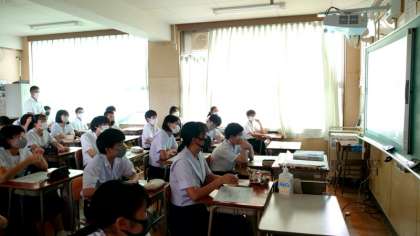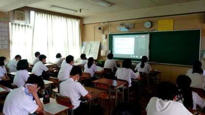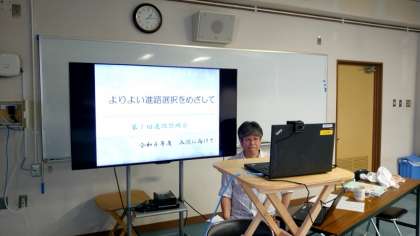 3年生対象の進路説明会をリモートで行っています。体育館の工事により3年全員が集まれず、別室から教室にパソコンを通してオンラインで説明します。画像も音声も明瞭でしっかり聞き取れていますね。