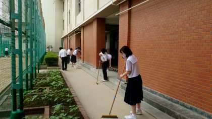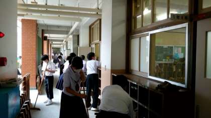 高津中学校恒例の大清掃が始まりました。月に1度、全員で校舎内を清掃します。高い窓など、日々の清掃で滞りがちな箇所を、皆で協力して美しくします。