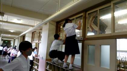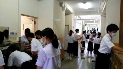 雨が心配されましたが、今のところ大丈夫な模様。皆さん、ホウキや雑巾を手に清掃活動に励んでいます。教室・廊下がキレイになると気持ち良いですね。