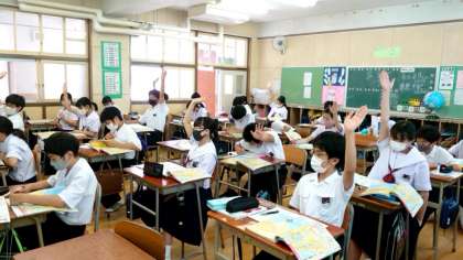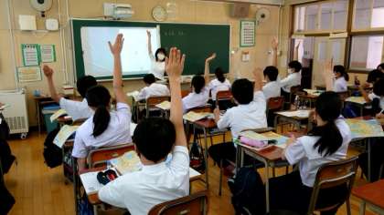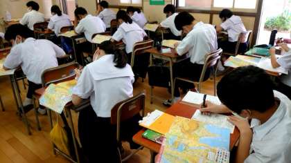 1年生社会科で「南アジア」の地理を学習中。インドやパキスタンなど地図帳で国名・首都を調べます。皆さん、先生からの質問に積極的に回答します。次々に手が挙がると授業が盛り上がりますね。