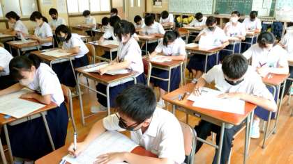1時間目「理科」のテストが始まりました。皆さん早速問題に取り組みます。限られた時間を有効に活用するため、わからない問題は後に回し、デキる問題を確実に解き進めましょう。
