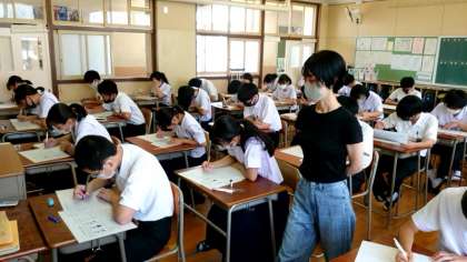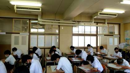 2時間目「英語」のテストが始まりました。3年生ではリスニングテスト(放送問題)が行われています。3年生では英文も長文が中心となり、うっかり聞き逃すと大変です。皆さん集中してスピーカーから流れる音声を聴き取っています。