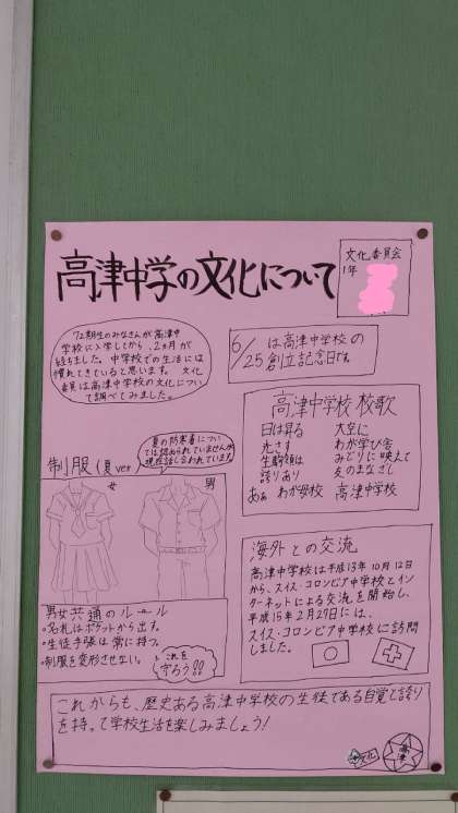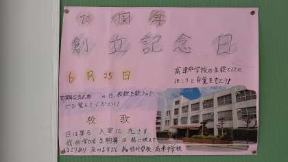 今日は高津中学校の「創立記念日」です。開校以来、地域の皆さまのあたたかいご支援を賜り創立70年を迎えました。