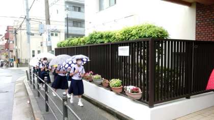 カラフルな傘を手に登校してきました